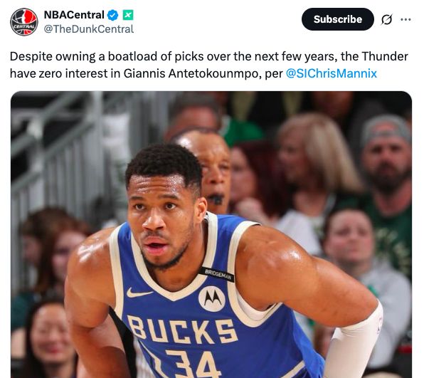 据Chris Mannix报道,尽管雷霆拥有未来几年的大量选秀权,但他们对字母哥毫无兴趣。