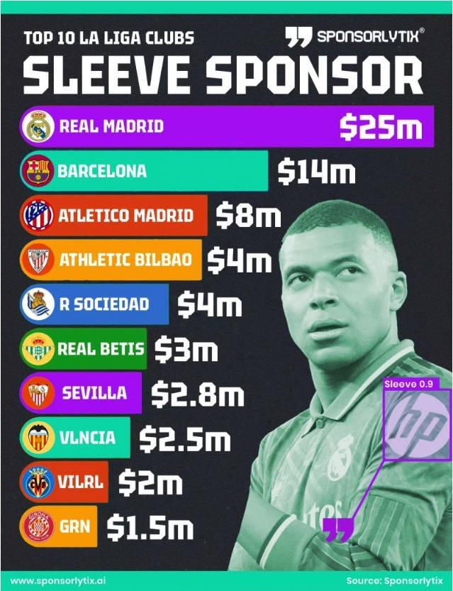 西甲各队袖标广告收入榜TOP10: